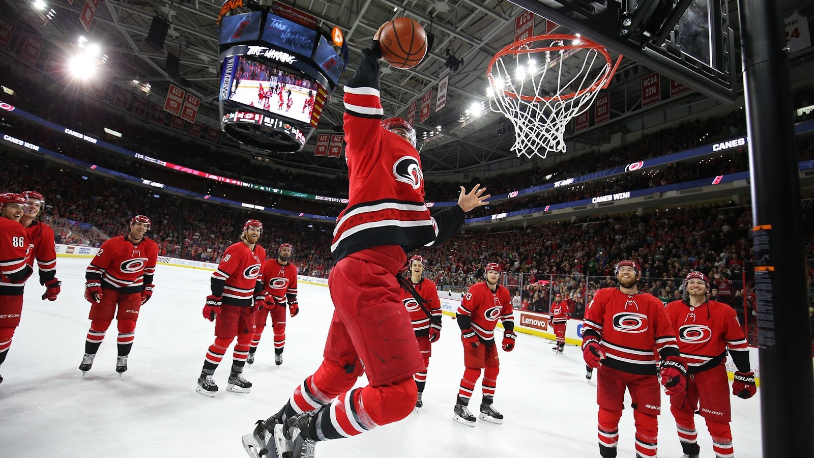 Following a 5 – 1 win against the Minnesota Wild, the arena staff brought a basketball hoop and ball out onto the ice. Players started moving around the makeshift court, getting open for passes and setting picks against each other, as defenseman Trevor van Riemsdyk made a cut to the basket for a slam dunk.