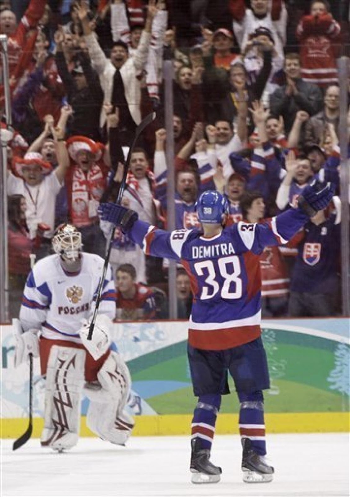 Locked in a 1 – 1 tie against the Russians and closing out the seventh round of a shootout, Demitra beat goaltender Ilya Bryzgalov over the blocker to capture the win for Slovakia. He turned to face the crowd, raising his arms as his teammates jumped over the boards to celebrate.